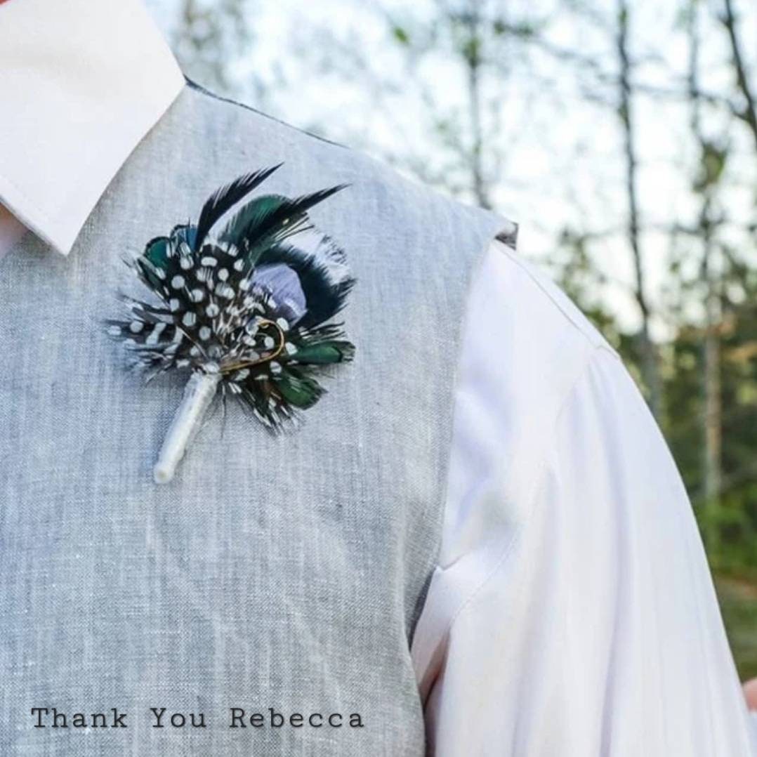Hunter Green, Fishing Boutonniere, White, Black, Gray, Green, Emerald, Feathers, Buttonhole, lapel, Pin-on, Corsage, Prom, Wedding, Event